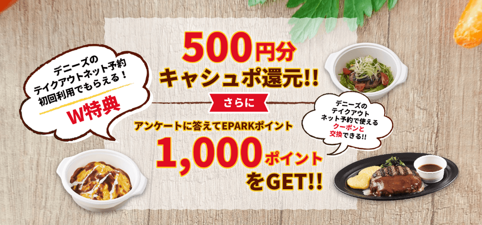 EPARKの会員(または今回新規に会員になられる方)、かつEPARKテイクアウトで、対象期間内でデニーズの料理をネット注文・受け取りをすること