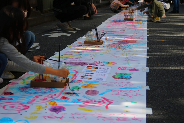 最終⽇の11⽉3⽇(⽊・祝)はメインイベント「坂にお絵描き/坂にお絵貼り」を開催。2020年、2021年はコロナ渦でのイベント開催の制約の中、規模縮⼩して開催しておりましたが、今年は3年ぶりのフルバージョン開催です。神楽坂通りの上から下まで敷いた700mの真っ⽩なロール紙に、誰でも⾃由に絵の具でお絵描きできます。遠⽅で来れない⽅などはオンライン参加も可能。事前に⾃宅などで描いた絵をスマホで撮って送ると、当⽇実⾏委員がプリントして路上に貼ってくれます。