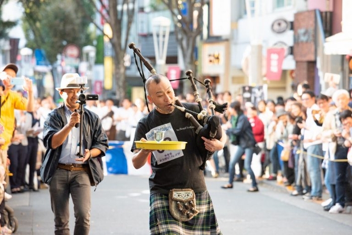 ⽇中は神楽坂通りを、神楽坂の飲⾷店のギャルソンがトレイを持って⾛り、猫メイクをしたコスプレイヤーやこども達がハロウィンパレードします。毘沙⾨天善國寺では昼は富⼭県南砺市の物産展があり、夜は南砺市から来た唄い⼿・踊り⼿が⽇本最古の⺠謡と⾔われる「こきりこ ささら踊り」を披露します。