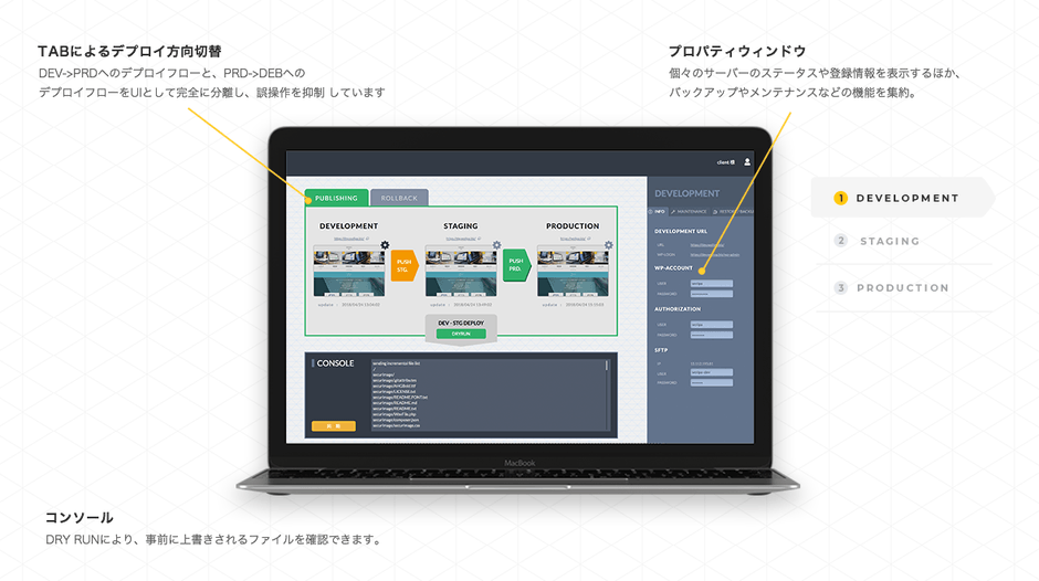 開発・ステージング・本番の3環境を分離した運用についても、専用管理画面による状態確認、簡単操作で各環境間のコンテンツ同期、WordPress本体のバージョンアップやプラグインの管理が行えますので、ストレスフリーな開発、安全なサイト公開を実現できます。