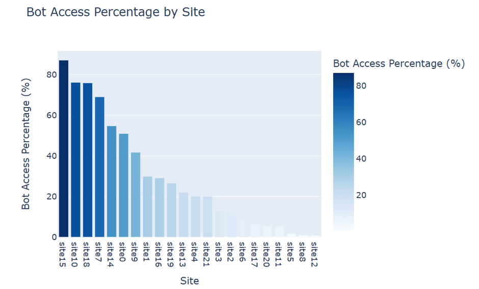 このようにボットのアクセスが非常に多いサイトがあることがわかります。一方で、一部のサイトではボットのアクセスは数%程度の低い割合であり、サイトによって状況が大きく異なることがわかります。