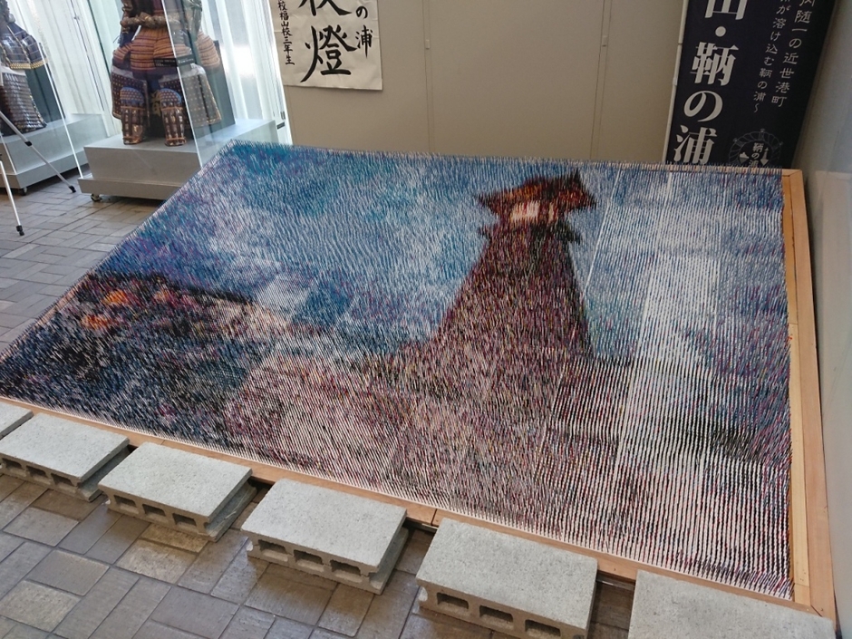 合計44,720本のつまようじで作られた巨大なアートで、遠く(斜め)から見ると常夜燈の姿がくっきりと見え、近くで見るとまるで地平線までつまようじで埋め尽くされているようです。日本遺産にも認定された「鞆の浦」の魅力が伝わる作品になっています。