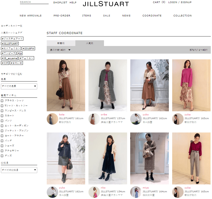 JILL STUARTの公式通販で利用されている商品画像は海外モデル画像、物撮画像がメインです。その商品情報に加え、販売員のコーディネート画像が表示されることで、お客様の等身大に近い販売員の画像を参考に購入の意思決定力が上がったと推測します。