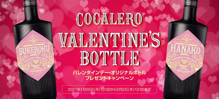プレミアムリキュール「コカレロ」といった洋酒の輸入販売を行うアイデイ商事株式会社(所在地:大阪市北区、代表者:土居 景久、以下:当社)は、新型コロナウイルスの影響により、自宅でのバレンタインを過ごす方に向けて、「コカレロ・ネグロ」のオリジナル名入れボトルとリッツカールトンに特別オーダーしたプレミアムな「オリジナル唐辛子ショコラ」のセットを40名様にプレゼントするTwitterキャンペーンを2021年1月25日(月)~2月2日(火)12時迄の期間で行います。