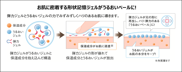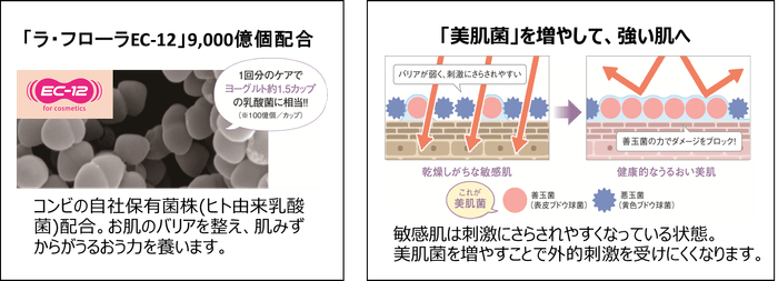 本製品は、自社開発(※)の乳酸菌「ラ・フローラEC-12」を9,000億個配合し、摩擦に弱い敏感肌をワンステップでケアできる、オールインワンジェルです。肌の表面には、腸内環境と同じように「善玉菌」と「悪玉菌」が存在します。乳酸菌「ラ・フローラEC-12」は「善玉菌」=「美肌菌」を増やしお肌のバリア機能を整えて肌みずからがうるおう力を引き出すことが分かっています。さらに、肌に密着する形状記憶ジェルがうるおいベールとなり、繊細な肌をしっかりと包み込みます。
