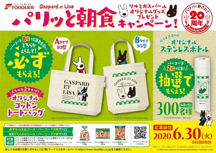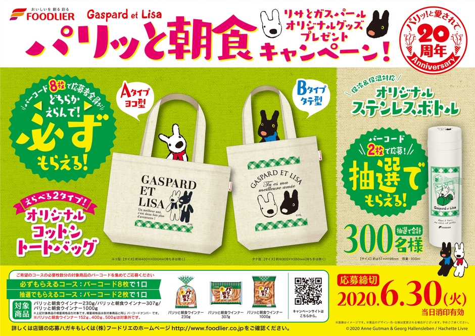 株式会社フードリエ(本社:大阪府高槻市、代表取締役社長:石野 克彦)は、2020年4月1日(水)~6月30日(火)までの期間で、『リサとガスパール オリジナルグッズプレゼント パリッと朝食キャンペーン』を実施いたします。