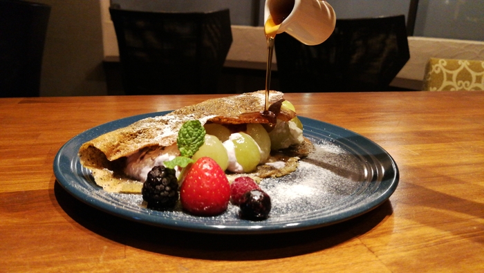 また、クレープの皮も一応自家製で都度作った物だったがオーナーからは『この皮がこのクレープにベストなのか?』と問われ、アッサムミルクの紅茶葉を練り込んだクレープ皮に変更した。これはこれが当たり前、こんなもんだろう、と気を抜くな!と常に指導されている」との事。