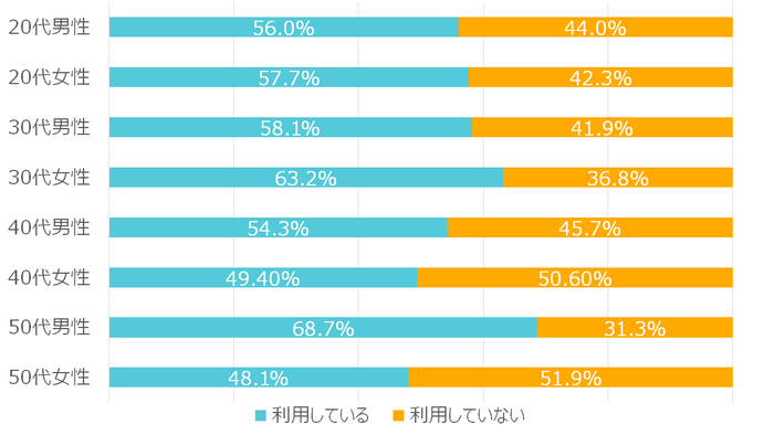 ご覧の通り、最も利用率が高かったのは「50代男性」で68.7%、最も利用率が低かったのは「40代女性」の49.4%という結果に。