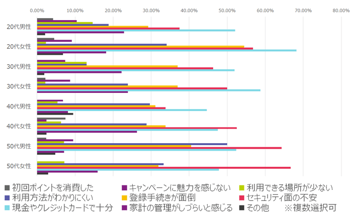 年代・男女別に見ると、どの年代でも見られたのが、「登録手続きが面倒」、「セキュリティ面の不安」、「現金やクレジットカードで十分」が比較的多いという結果に。