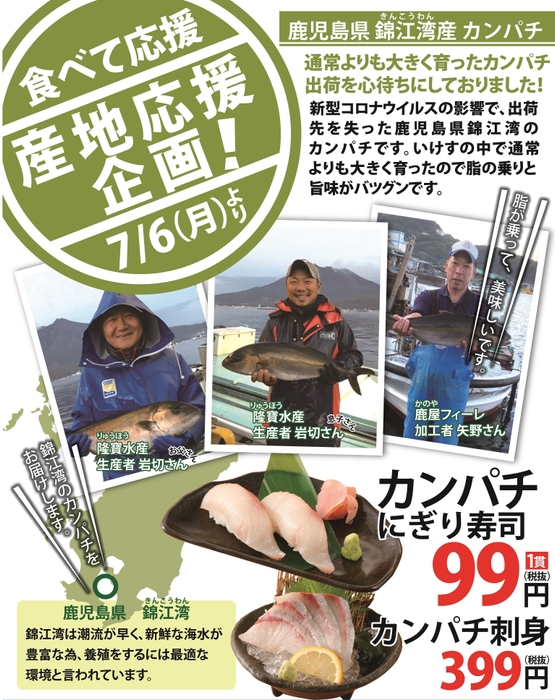 「食べて」産地を応援!鹿児島県のカンパチをにぎり1貫99円! はなの舞・さかなや道場で『ご来店感謝祭』第3弾 7/6より開催!