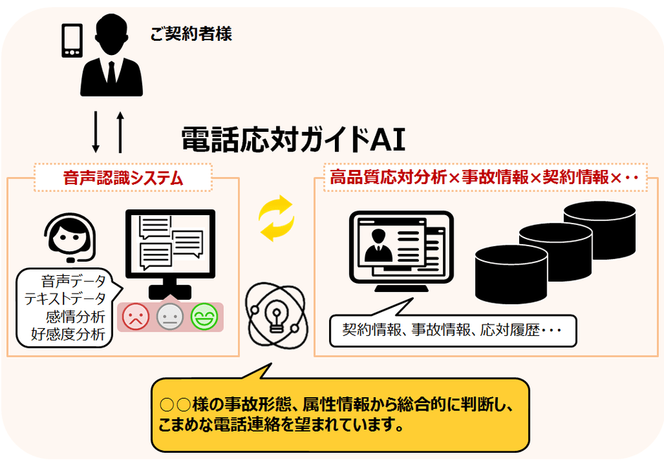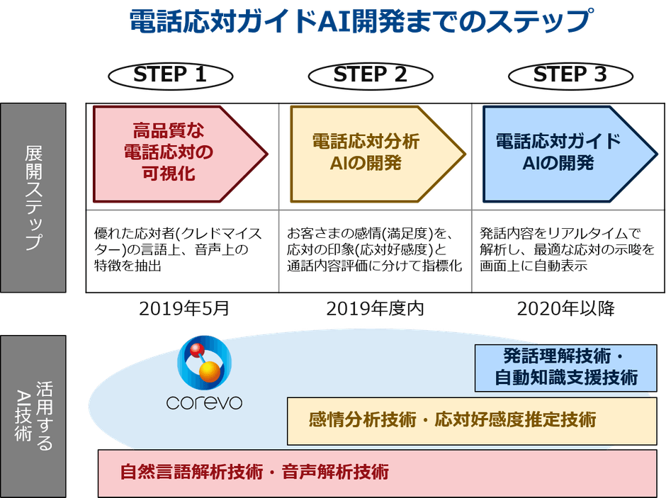 損害保険ジャパン日本興亜株式会社(代表取締役社長:西澤 敬二、以下「損保ジャパン日本興亜」)と、NTTコミュニケーションズ株式会社(代表取締役社長:庄司 哲也、以下「NTT Com」)は、2019年5月から損保ジャパン日本興亜の保険金サービス拠点(※1)における電話応対を、NTTグループのAI関連技術「corevo(R)(コレボ)(※2)」を活用して分析し、全ての社員による高品質な電話応対を可能にする電話応対ガイドAIの開発を開始します。