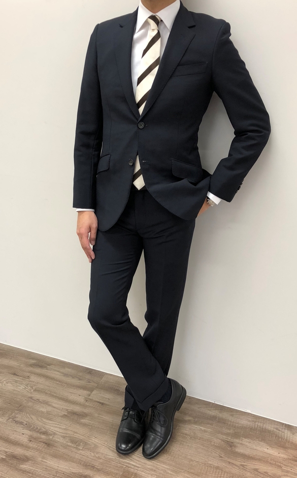 営業職の人にとっては、誰から見ても好感度の高いコーディネートが大切です。日本人の髪や肌の色に馴染みやすいネイビースーツは、全身のシルエットも締まって見えるので一番おすすめです。無地が基本ですが、細めのピンストライプなら問題ありません。合わせるのは、ロックポート「ドレスポーツ モダン」黒のキャップトゥ。最もベーシックなビジネスシューズでありながら、クッション性もあり、ビブラム社のソールを使用しているので滑りにくいのも特徴です。さらにウォータープルーフモデルを選べば、突然の雨でも安心です。