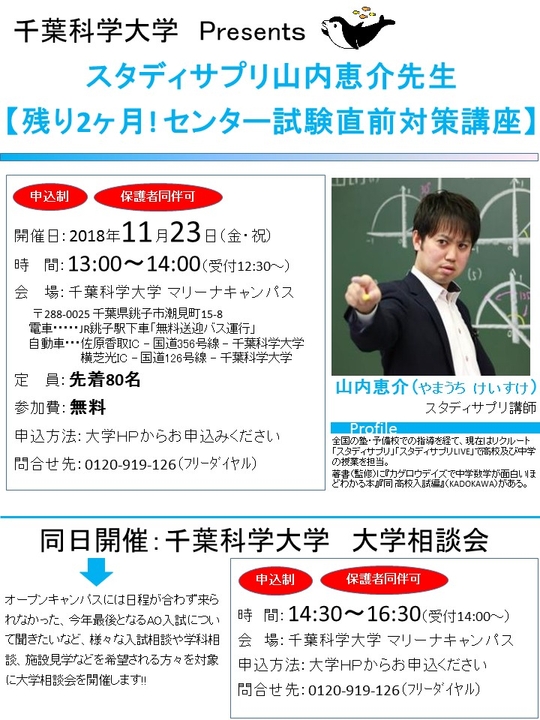 センター試験にチャレンジする高校生のために、千葉科学大学(千葉県銚子市潮見町)は2018年11月23日(金・祝)、スタディサプリの人気数学講師・山内恵介(やまうち・けいすけ)先生を招き、大学マリーナキャンパスでセンター試験直前対策講座を開催します。申し込み締め切りは11月20日(火)。先着80人のみ無料で受講でき、HPもしくは電話での早めの申し込みを呼び掛けています。