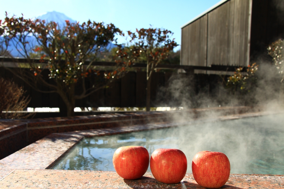 「富士眺望の湯ゆらり」には、世界文化遺産・富士山を眺めながらお風呂に浸かれる露天風呂、「パノラマ風呂」があります。毎月26日は「パノラマ風呂」に季節感のある物を浮かべて「変わり湯」を楽しんでいただくイベントが「お風呂の日」です。2019年最初の「変わり湯」は、美容と健康に効果が期待できる「りんごの湯」です。