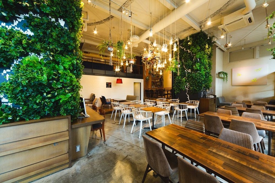 (1) 店内がグリーンで包まれる!より心地良い、くつろいでいただける空間を目指して思い切った緑化計画実施しました。新しい家具のチョイスも含めて店内の変貌ぶりにご期待ください。