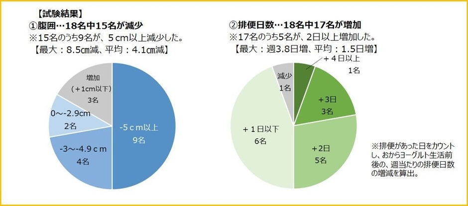 アンケート調査、体重、体脂肪量、筋肉量、腹囲、排便日数・排便量・排便回数・おならの回数を測定。前後比較として、5月18日~6月8日の3週間を試験前の観察期間として、同様のアンケート調査を実施した。