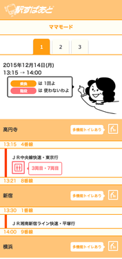「ママモード」は、既存の乗り換え案内サービスとは異なり、ママに優しい便利機能を追加しました。詳しくは、「ママモード」紹介ページもご覧ください。