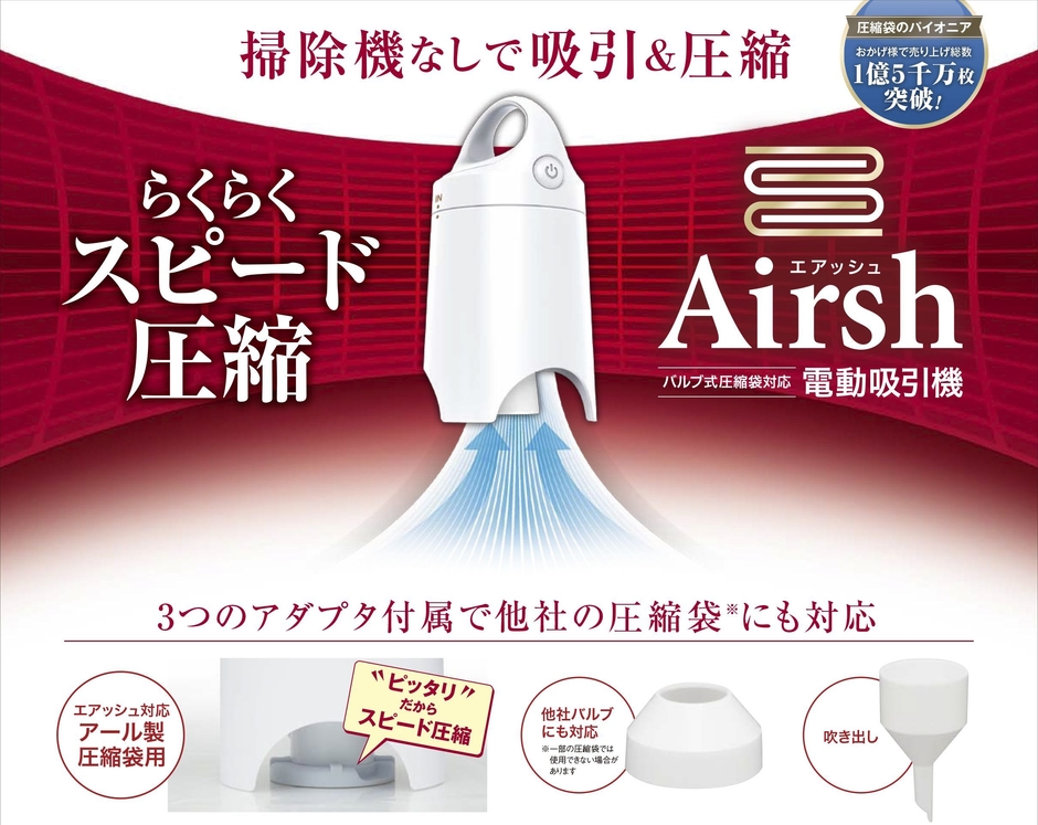 圧縮袋のパイオニアとして展開を続ける株式会社アール(所在地:大阪府大阪市、代表取締役:辻本 敦也)は、布団圧縮袋をスピーディに圧縮できる、コンパクトな【電動吸引機Airsh(エアッシュ)】を、3月上旬から全国のホームセンター・通販等にて販売開始いたしました。[希望小売価格:本体4,500円(税抜)]