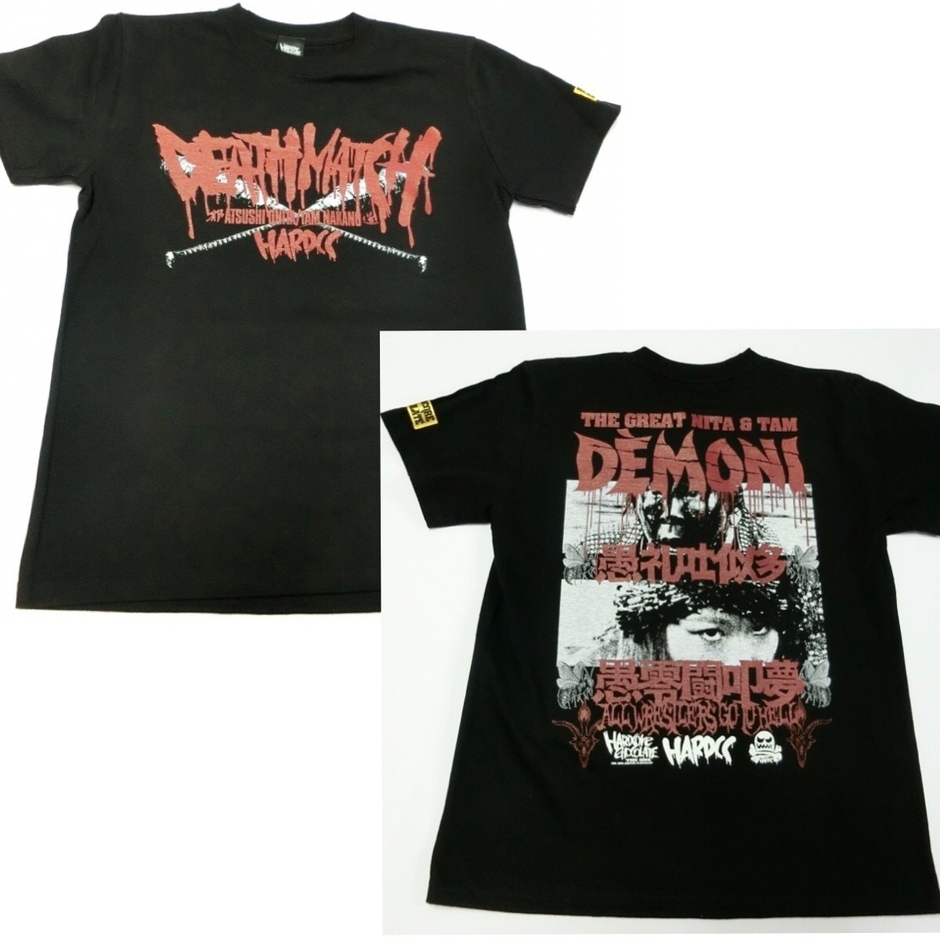 ハードコアチョコレートは、神出鬼没な2人をアパレル化。ハードコアで悪魔的な呪いのデザインに仕上げた。フロントの有刺鉄線バットに邪道の文字は間違いなく大仁田厚の象徴。しかしバックプリントの「DEMONI」の文字でそれは黒く塗りつぶされる!!