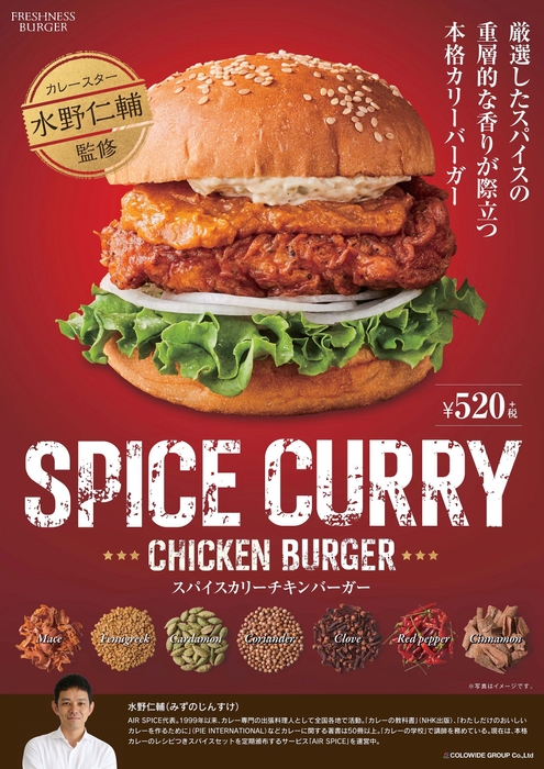 コロワイドグループの株式会社フレッシュネス(代表取締役社長:船曵 睦雄、本社:神奈川県横浜市西区、以下 フレッシュネス)が展開するハンバーガーチェーン「フレッシュネスバーガー」では、カレースター・水野 仁輔氏監修により開発した「スパイスカリーチキンバーガー」を7月18日(水)より発売いたします。