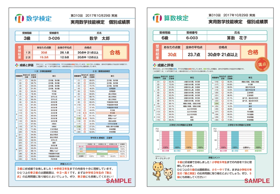 2018年3月3日(土)実施の第318回実用数学技能検定の受検結果(4月発送)から、リニューアル版の個別成績票を採用します。そのため、4月15日(日)に実施する個人受検(3月13日(火)まで申込受付中)も、このリニューアルした個別成績票をお届けします。なお、今回の全面リニューアルによる検定料の値上げはございません。
