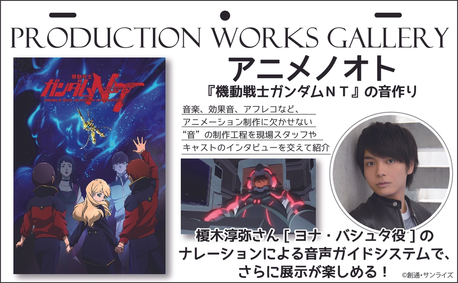 アニメの制作工程を紹介する「Production Works Gallery」では、今回は「アニメの音」に注目し、ガンダムシリーズ最新作『機動戦士ガンダムNT』を題材に、音楽、効果音、アフレコなど、アニメーション制作に欠かせない“音”の制作工程を現場スタッフやキャストのインタビューを交えて紹介します。音声ガイドやシアタールームも用意し、『機動戦士ガンダムNT』の音響世界を、じっくりとご堪能いただけます。