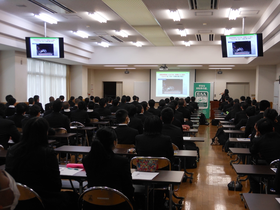 さらに、新学期を前にこれから自転車を購入する生徒に向けて、自転車製品の安全性と選ぶポイントについて講演し、「春休みに新しい自転車を選びに行くという方も多いと思います。自転車は生活用品ではなく“車両”です。安全基準に適合した製品に貼られるBAAマークを目印に自転車選びをすると良いでしょう」と話しました。