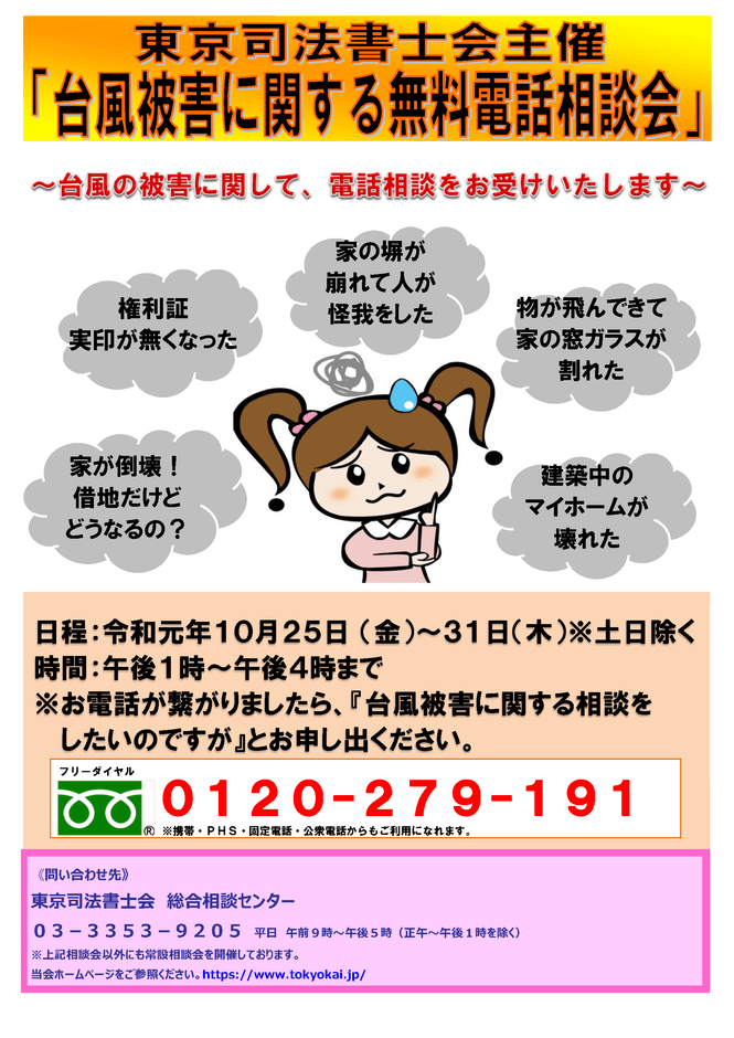 「台風被害に関する無料電話相会」10/25~10/31開催※土日除く (主催:東京司法書士会)