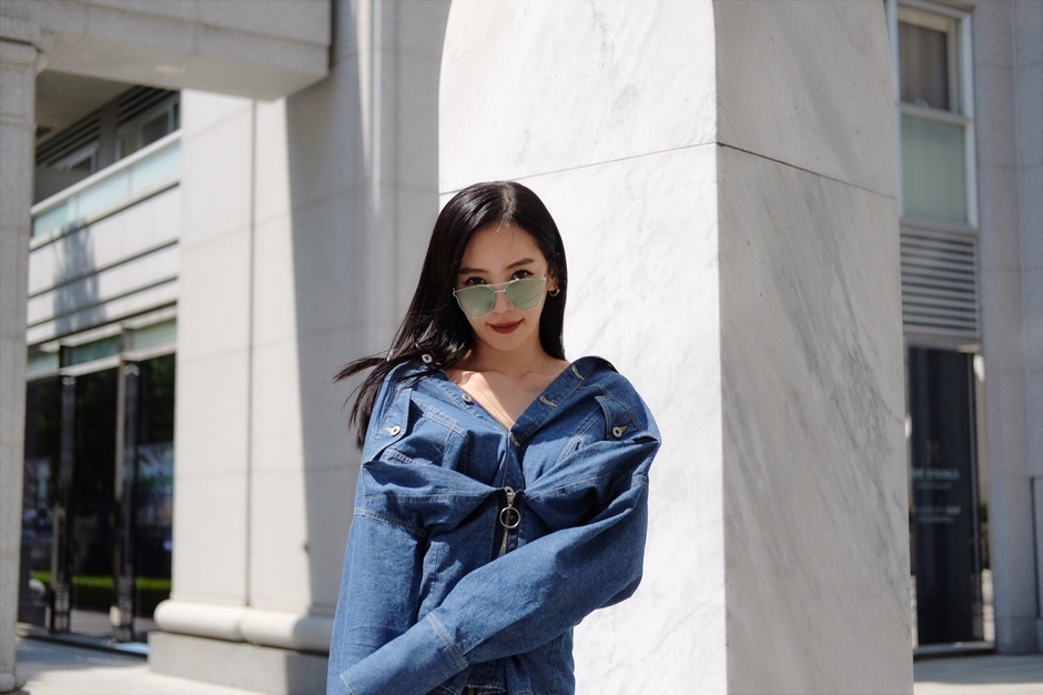 デニムシャツは今年らしく襟を抜いてオフショルダー風に着るのが旬。ウエストのファスナーを外せばエフォートレスなシルエットになり、2WAYでの着こなしが楽しめます。デニムワイドパンツは再度のスナップボタンをはずして、大胆にロールアップしてはいてもOK。