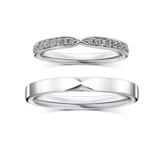 輝き躍動する街で出会い、絆を結ぶ「ふたり」をイメージ。普遍性のあるデザインながら中央のカットが生みだす“ひと味違う表情”が光るリング。メレダイヤモンドが敷き詰められたもう片方のリングはエンゲージリングを受け止めるフォルムで、重ね着けにも最適です。