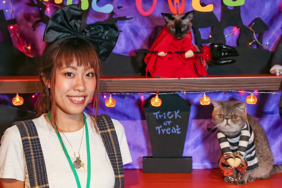 ●イルミニャーションで彩られた店内はハロウィンムードたっぷり! 猫さんも仮装で大集合