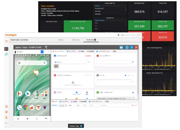 HeadSpin Inc.は、世界初のConnected Intelligence Platform(TM)として、米国で急成長中のスタートアップ企業で、既に各国通信キャリア、メガITサービス事業者等1,000社が採用しています。モバイルアプリのパフォーマンスをモニタリングする環境として、デバイスファーム・自動テスト実行環境・モニタリングをノンストップで提供しているサービスで、多様なネットワーク、ロケーション、デバイスを使い、利用者が実際に使用する環境に近い形でパフォーマンスのテストを行うことができます。