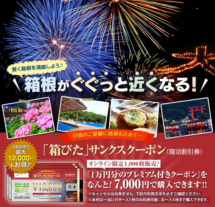 箱根温泉旅館ホテル協同組合が運営するオフィシャルサイト「箱根の温泉公式ガイド『箱ぴた』」では、毎回大好評のお得な宿泊割引券「箱ぴた」サンクスクーポンを、2019年6月11日(火)午前10時より、1,000枚限定でオンライン販売いたします。10,000円分のクーポンが7,000円で購入できる、たいへんお得な機会となっています。クーポンは、宿泊割引券として、一泊につき1枚、「箱ぴた」掲載の旅館・ホテル106軒にてご利用いただけます。