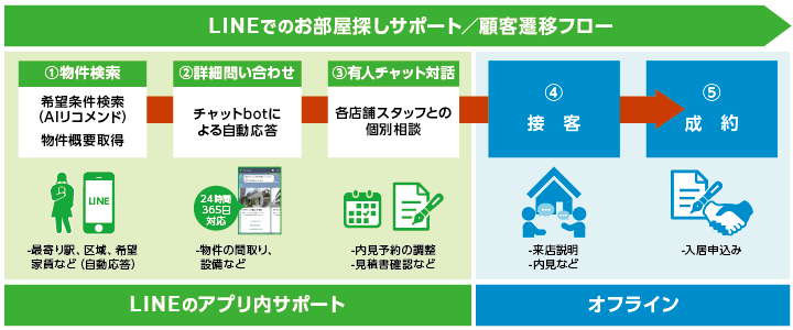 ハウスコムは不動産賃貸仲介の直営店舗を全国に162店舗持ち、首都圏から郊外まで幅広い物件を取り扱っております。近年のスマホとソーシャルメディアの普及に伴い、お客様にサービスをより便利にご活用いただくため、SNSで圧倒的なリーチを誇るLINEを利用した新しい顧客サポートのサービス導入を行いました。本サービスにより、お客様は普段利用しているLINEのアカウントから物件検索やお問い合わせを直接できるようになり、手間やストレスなくお部屋探しを進めていくことができるようになります。また、ハウスコム独自の個人専用問い合わせページ「マイボックス」と連携しており、顧客情報や物件と繋がることで、多様な物件の検索・問い合わせへの迅速な対応が可能となっています。今後もハウスコムは積極的にITやAIの技術を取り入れて、お客様が安心・手軽・便利にご利用いただけるサービスを提供し続けていきます。
