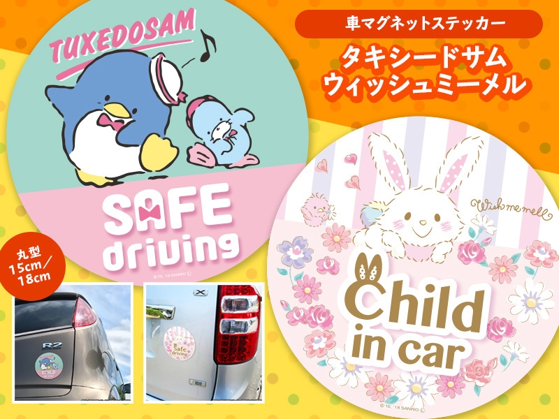 人気の『シナモロール』、マグネットステッカーではめずらしい『タキシードサム』と『ウィッシュミーメル』、「BABY IN CAR」「CHILD IN CAR」「SAFE DRIVING」の各フレーズを組み合わせ、ミニバンのリヤハッチに映える直径18cmタイプと直径15cmタイプを揃えて全18種(キャラクター3種×フレーズ3種×サイズ2種)をラインナップしています。