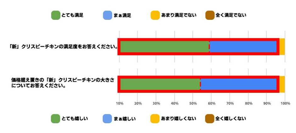 さらに、「新」クリスピーチキンの食感については、100人中96人が「カリッとしていた」と回答(※)し、衣はカリッと、中のお肉はしっとりにリニューアルしたクリスピーチキンの進化を実感いただきました。また、新旧のクリスピーチキンを比較して、「明らかに衣がザクザクになっていたし、肉の食感も新しい方がしっとりしていて、食べやすかった。」や「大きくなり、旧クリスピーチキンより、カリッとしていておいしかった」という感想をいただきました。まだ、本商品をお試しいただけていないお客さまは、是非この機会にお楽しみください。