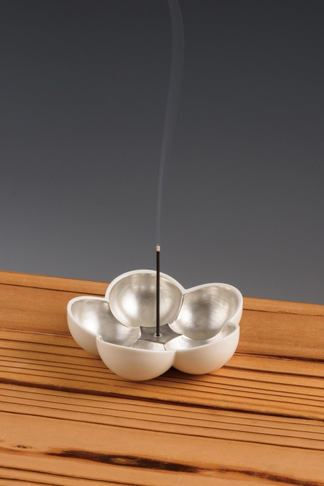 お香はフランス産天然ラベンダーオイルを配合した落ち着いた香り、お香立は梅栄堂にちなんだ「梅」の花をモチーフにデザインされており優しい形状でありながら、モダンな銀色で様々なインテリア空間に溶け込みやすいデザインに有田焼の職人がひとつひとつ丁寧に焼き上げました。