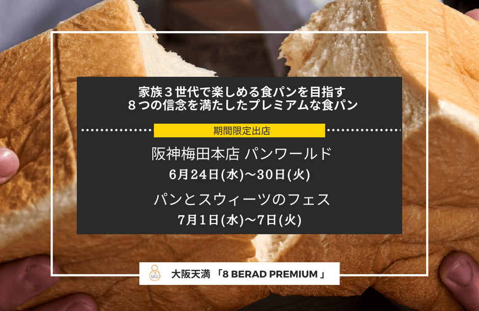 高級食パン専門店「EIGHT BREAD PREMIUM」(本社:大阪市中央区)は、6月24日(水)~7月7日(火)迄の期間限定で商業施設「阪神梅田本店」と「高島屋 洛西店」にて高級食パンの出店販売を行います。