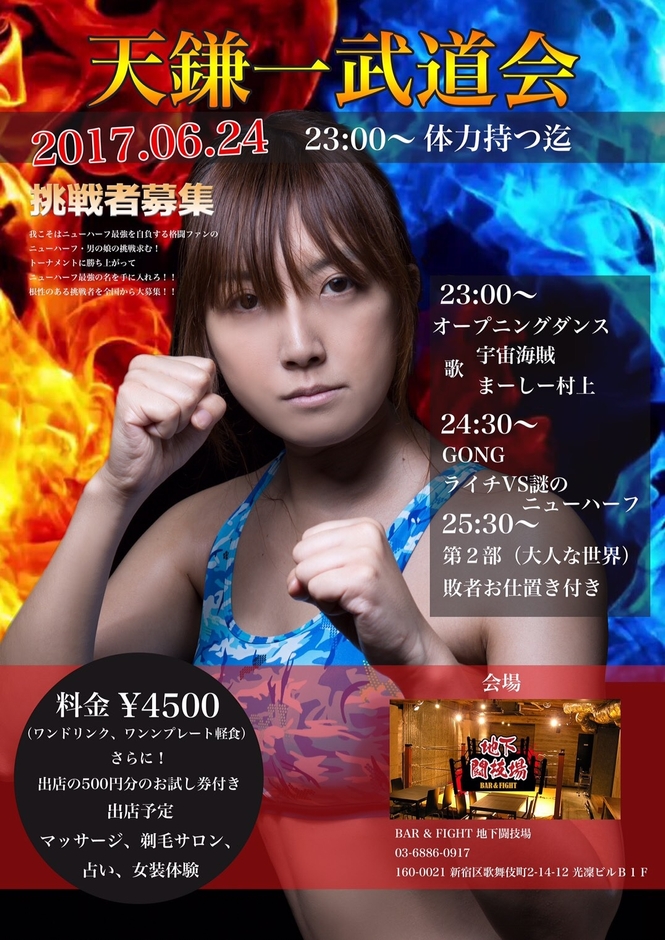 2016年2月に歌舞伎町にオープンした“店内にリングのある”コンセプトバー『BAR&FIGHT 地下闘技場』(所在地:新宿区歌舞伎町2丁目)は、6月24日(土)に最強ニューハーフを決めるべく『天鎌一武道会』を開催いたします。