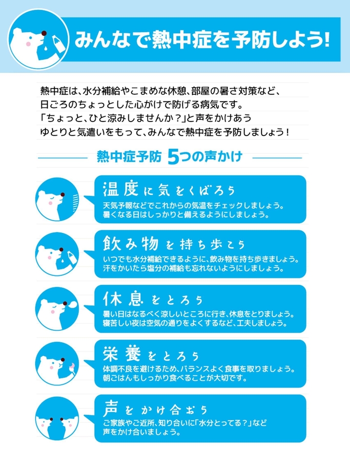 「熱中症予防声かけプロジェクト」は、環境省・自治体・企業が一体となって取り組む、熱中症予防を目的としたプロジェクトです。熱中症についての正しい知識の普及を図るとともに、共通ロゴマーク等を用いて賛同企業、賛同自治体等が各々の活動を通じ熱中症予防のための声かけを実施します。( http://www.hitosuzumi.jp/ )