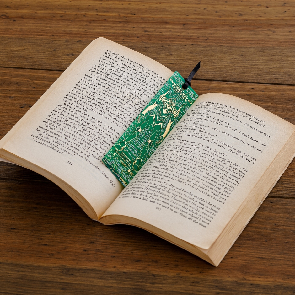 基板アート栞は、工業用プリント基板で製造しました。基板の材料、工程、製造方法は、本来の基板と全く同じです。本や手帳、そして手を傷つけないよう基板の端面より0.15mmの銅箔を削除しています。日本で設計、製造しており、全ての商品はRoHS対応品(鉛不使用商品)です。基板は金メッキ処理をしています。