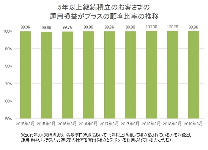 その上で、昨年公表いたしました「投資信託の販売会社における比較可能な共通KPI」における「投資信託の運用損益別顧客比率(2018年3月末時点)」において、プラス顧客の比率が97.7%となり、同時点の実績を公表した124の金融事業者の中で最高位となりました。