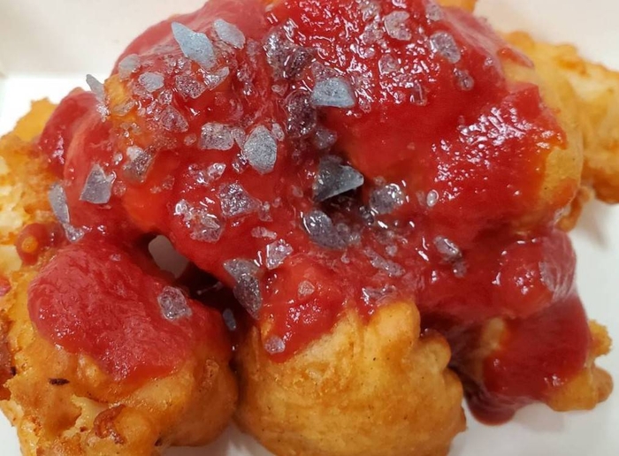「天下鳥ます」の鳥むね肉のからあげにトマトソースをかけ、さらにその上にパチパチキャンディーをかけたメニューです。まるでちぃたん☆に顔をシバかれたかのような味と食感を再現しました。