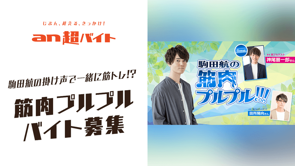 総合人材サービス、パーソルグループのパーソルキャリア株式会社(旧社名:インテリジェンス、本社:東京都千代田区、代表取締役社長:峯尾 太郎)が運営するアルバイト求人情報サービス「an」< https://weban.jp/ >は、思わず挑戦してみたくなるような「an超バイト」の新企画として、今大注目の声優・駒田航の筋トレ拡散バラエティ『駒田航の筋肉プルプル!!!』動画撮影を筋肉プルプルさせながら一緒にお手伝いをする“筋肉プルプルバイト”のプルラー1名募集!報酬は、日給50,000円を支給。さらにサイン入り色紙もプレゼントします。