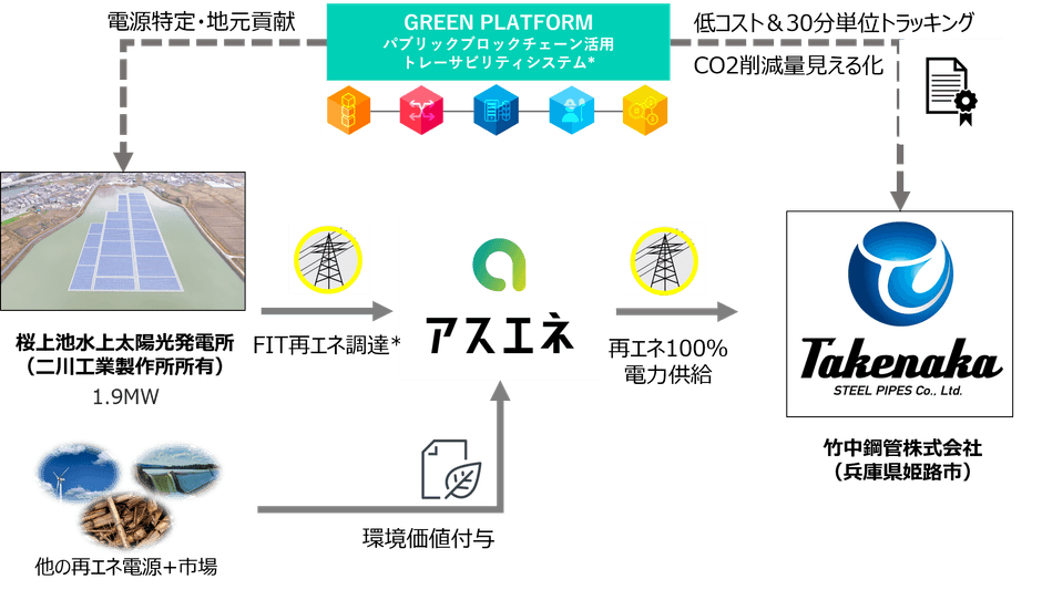 具体的には、当社が所有する兵庫県内1箇所のフロート式水上太陽光発電所(桜上池水上太陽光発電所 1,991KW)から生み出した電気を、小売電気事業者であるアスエネ株式会社(東京都品川区、代表取締役CEO:西和田 浩平)を通じて、ブロックチェーン活用のトラッキングシステムでマッチングさせ、竹中鋼管株式会社の自社オフィスや工場に電気を提供いたします。