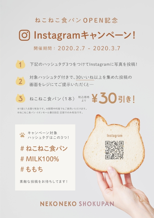 ご自身のインスタグラムに下記の3つのハッシュタグを付けて「ねこねこ食パン」を投稿していただき、「♥30いいね」をゲットすると、ねこねこ食パン1斤が30円引き!