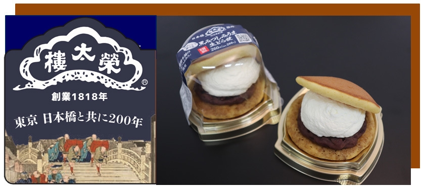内容 :榮太樓總本鋪監修のスプーンで食べる生どら焼です。榮太樓のこだわり素材「黒みつ」「つぶあん」を使用し、黒みつをしみ込ませた(下側の)どら焼生地の上に、生クリームを約50%ブレンドしたホイップクリームと、粒残りの良いつぶあんを合わせました。