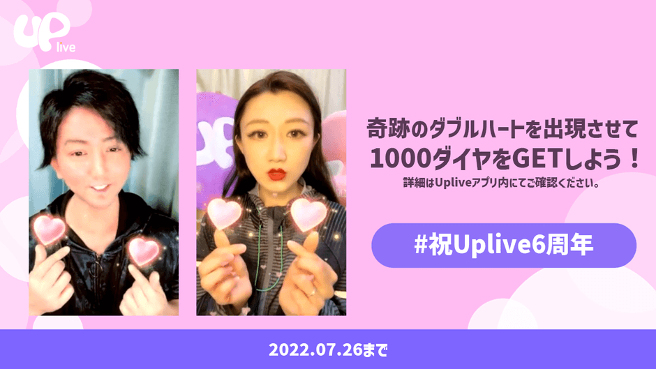 ダブルハートを出現させるのが難しいライバーは片手ハートや別のエフェクトを使用して「#祝Uplive6周年」のタグを付けてTwitterに投稿で600ダイヤの抽選に参加可能です。