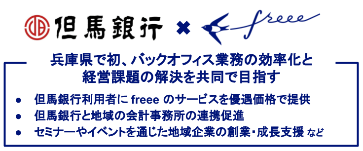 freeeは、株式会社但馬銀行(本店:兵庫県豊岡市、取締役頭取:倉橋 基)との業務提携を開始したことをお知らせします。freee にとって、兵庫県初の提携事例になります。今回の提携を通じて、「クラウド会計ソフト freee」「人事労務 freee」など freee が提供するサービスの活用を通じた地域の創業者や中小企業へのコンサルティングを但馬銀行と共同で推進してまいります。