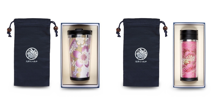 「ほっと電報」より「浅草たつみや 着物タンブラー」を発売! 西陣正絹帯の最も美しい柄の部分を使用したお祝い用商品!